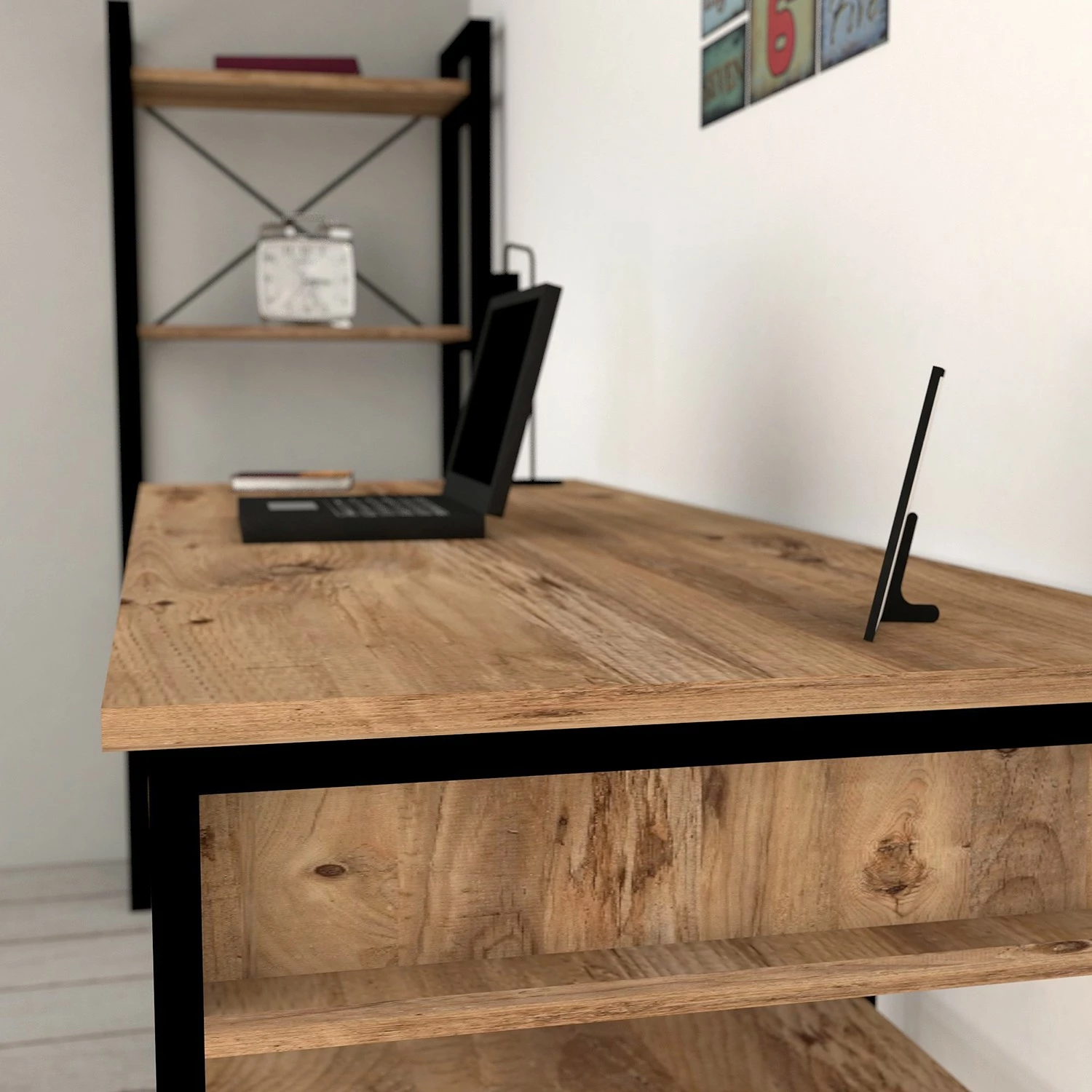 - Tischplatte & Ablagen: MDF (Mitteldichte Holzfaserplatte), melaminbeschichtet