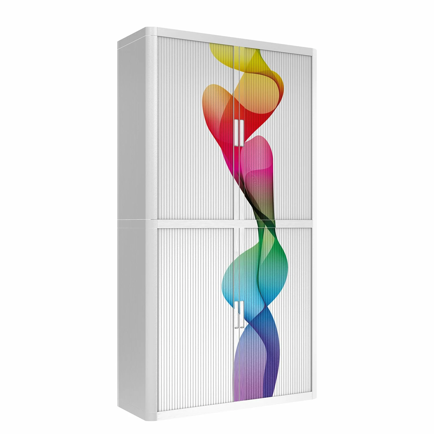 - Klare, geradlinige Form mit verspieltem Farbwellen-Motiv