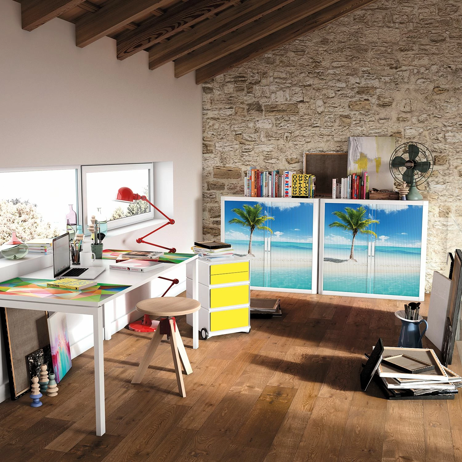 - Niedrige Ausführung: 2 versetzbare Metall-Einlegeböden für 2 Ordnerhöhen & zusätzlicher Stauraum
