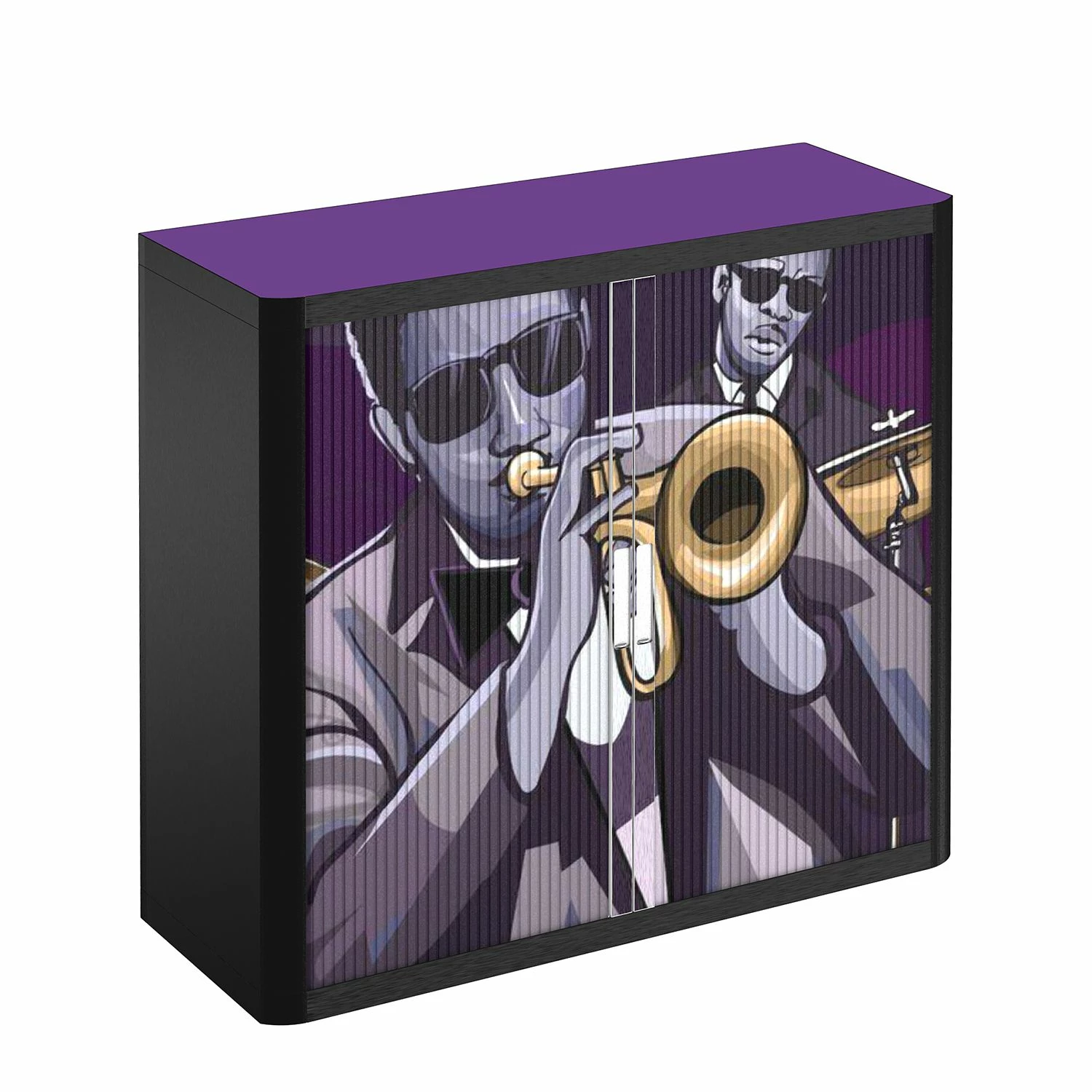 - Klare, geradlinige Form mit lila Jazz-Motiv