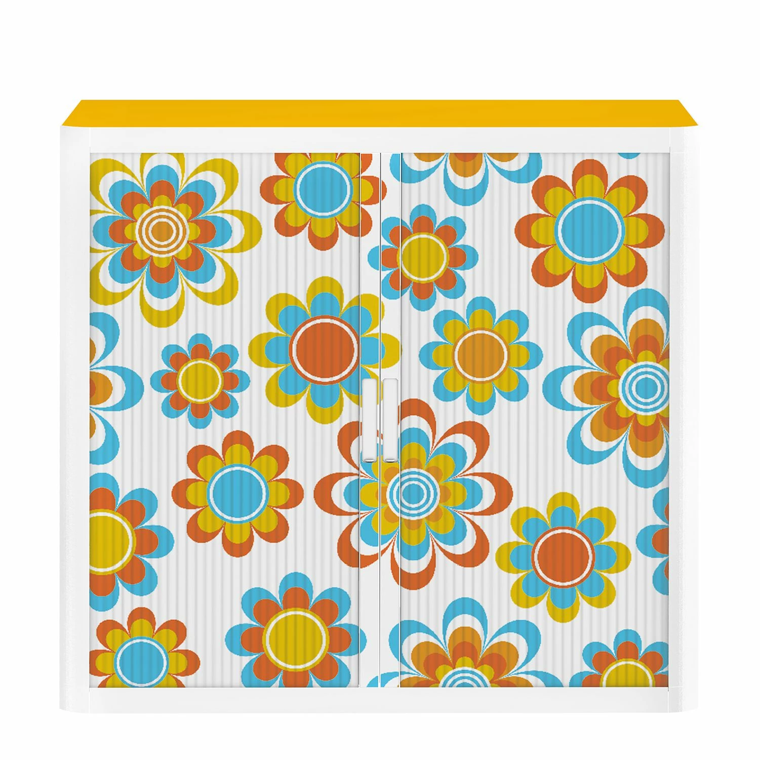 - Korpus: WeißOberplatte: OrangeTüren: Bunte Blumen
