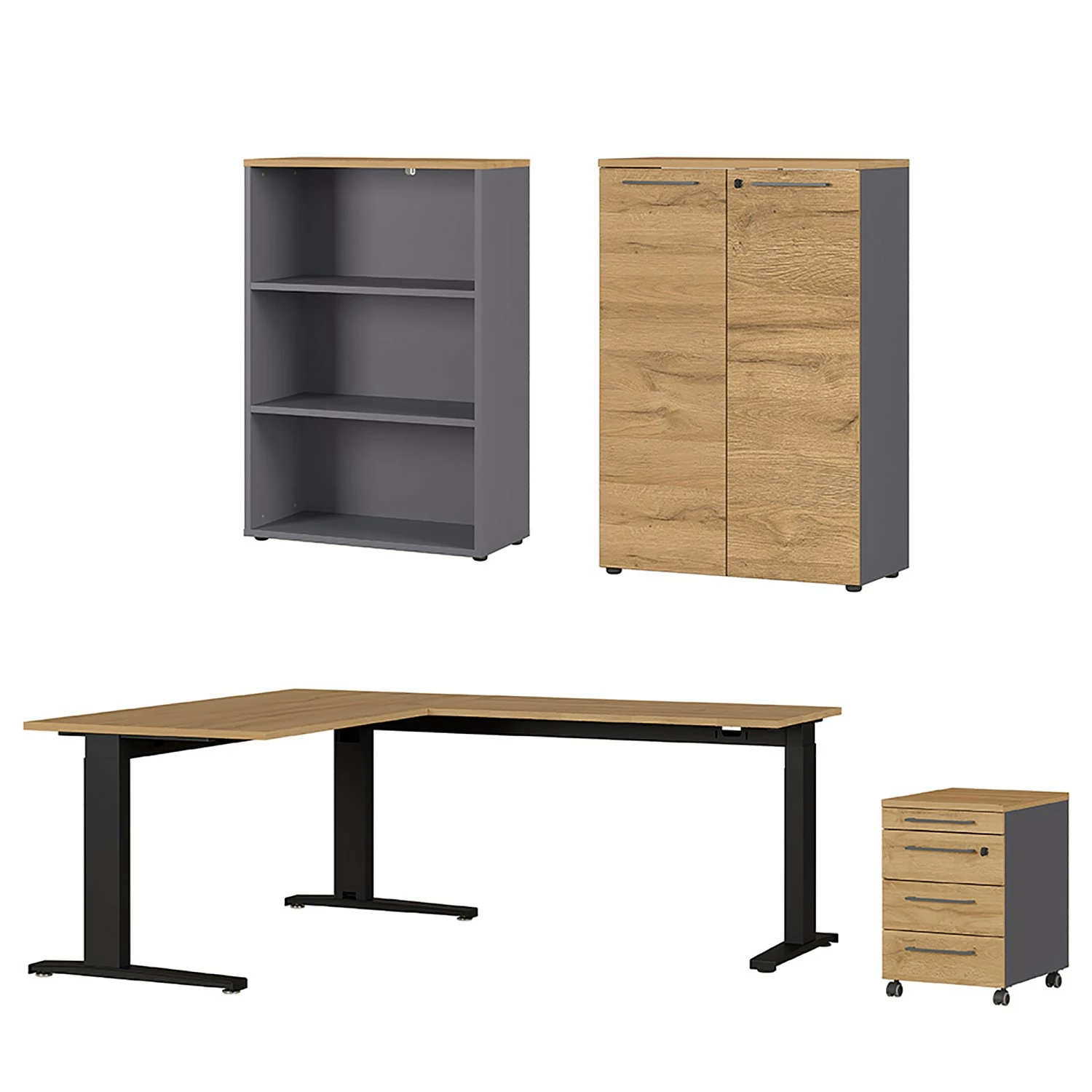 - Lieferumfang: Büroset bestehend aus 1 Eckschreibtisch, 1, Aktenschrank, 1 Aktenregal & 1 Rollcontainer ohne Dekoration