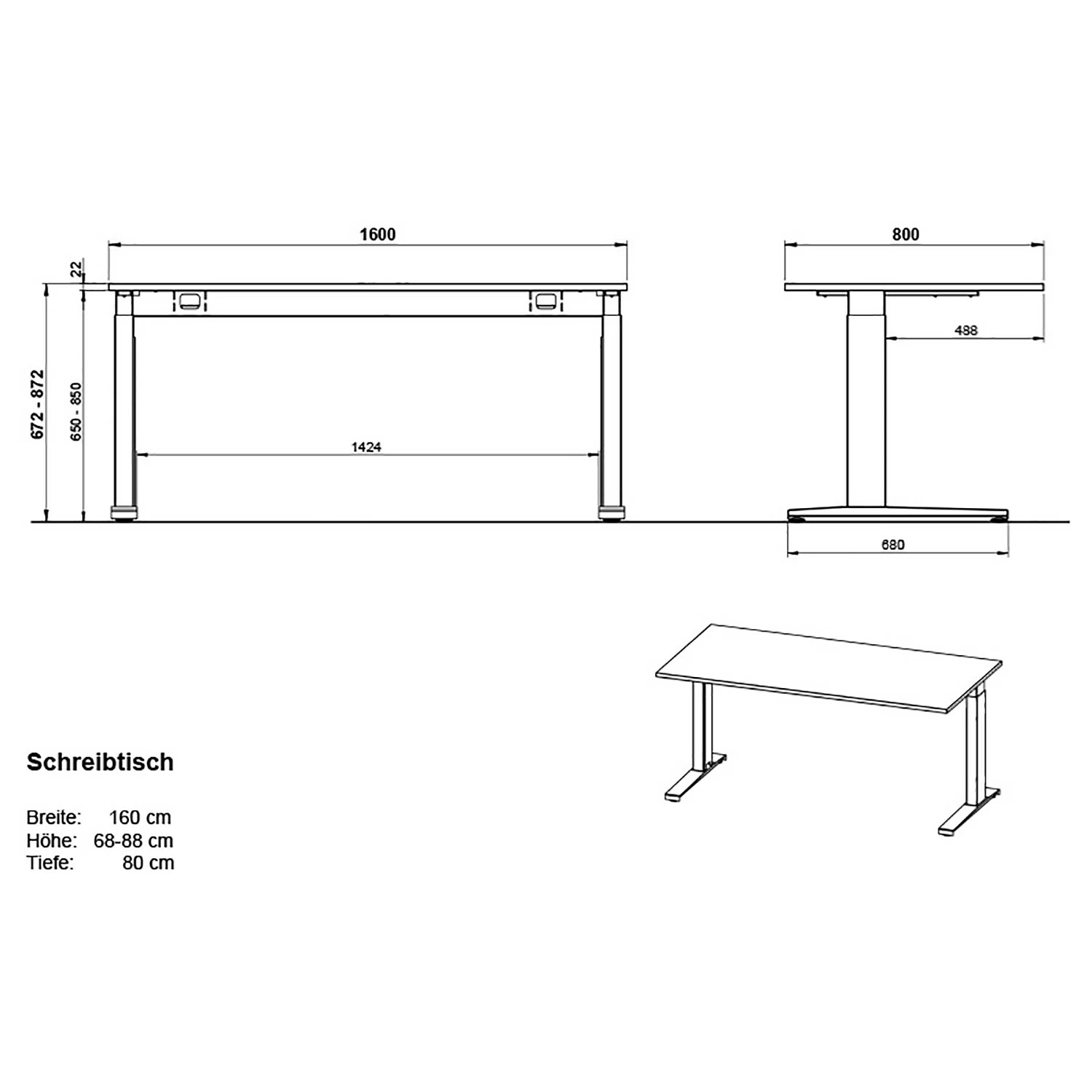 - Schreibtisch: 160 x 68-88 x 80 cm