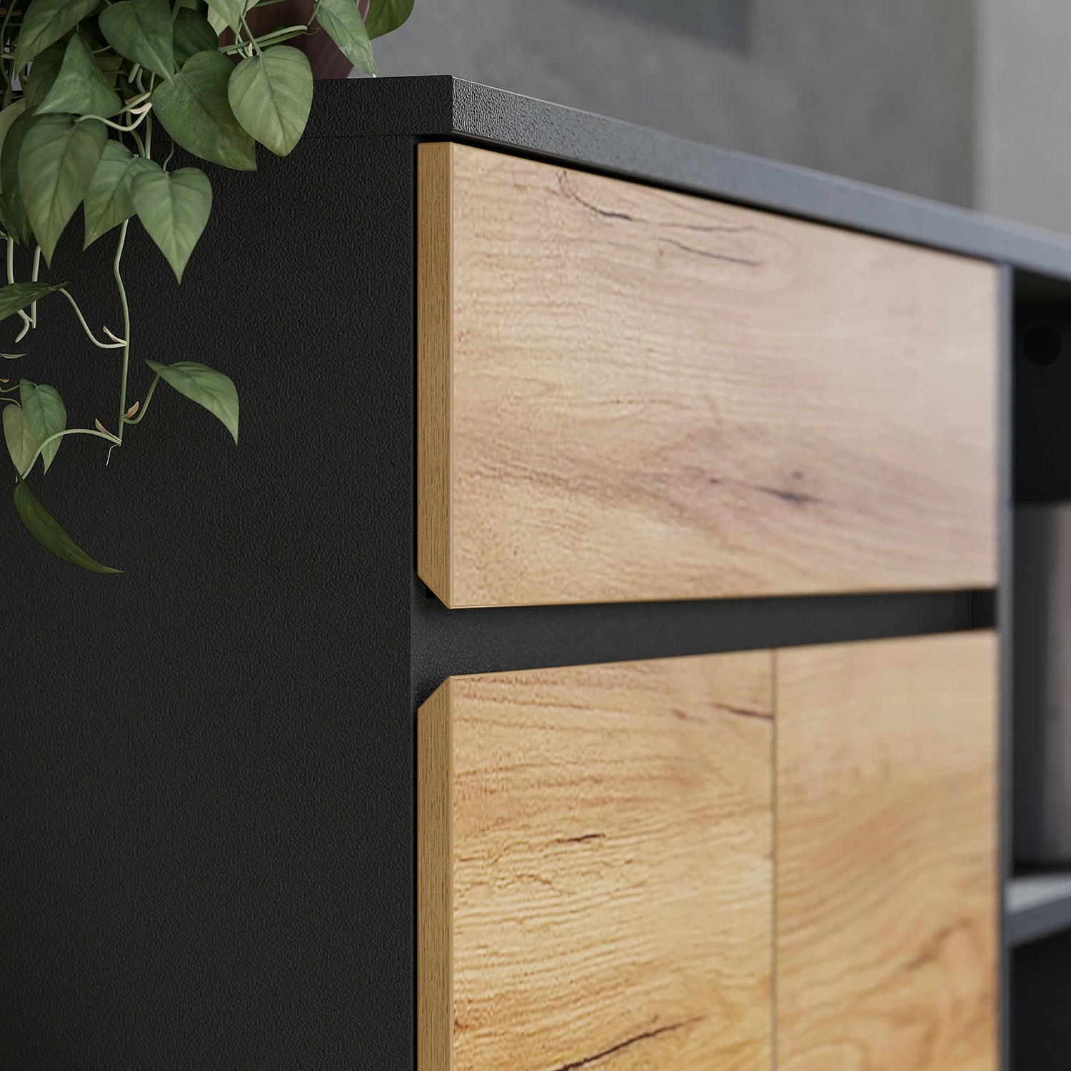 - Tischplatte & Front: Eiche Navarra Dekor