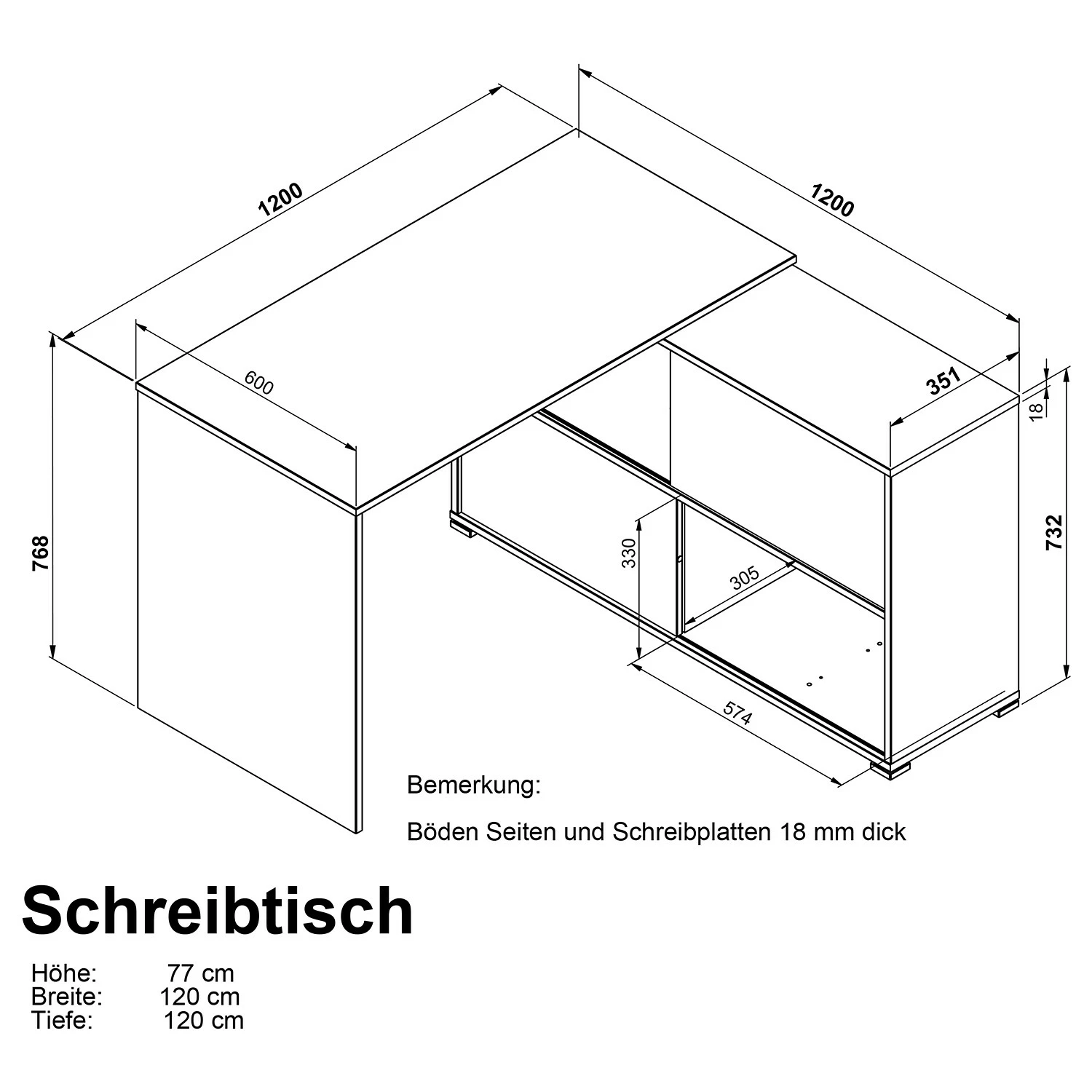 - Winkelschreibtisch: 120 x 76 x 120 cm