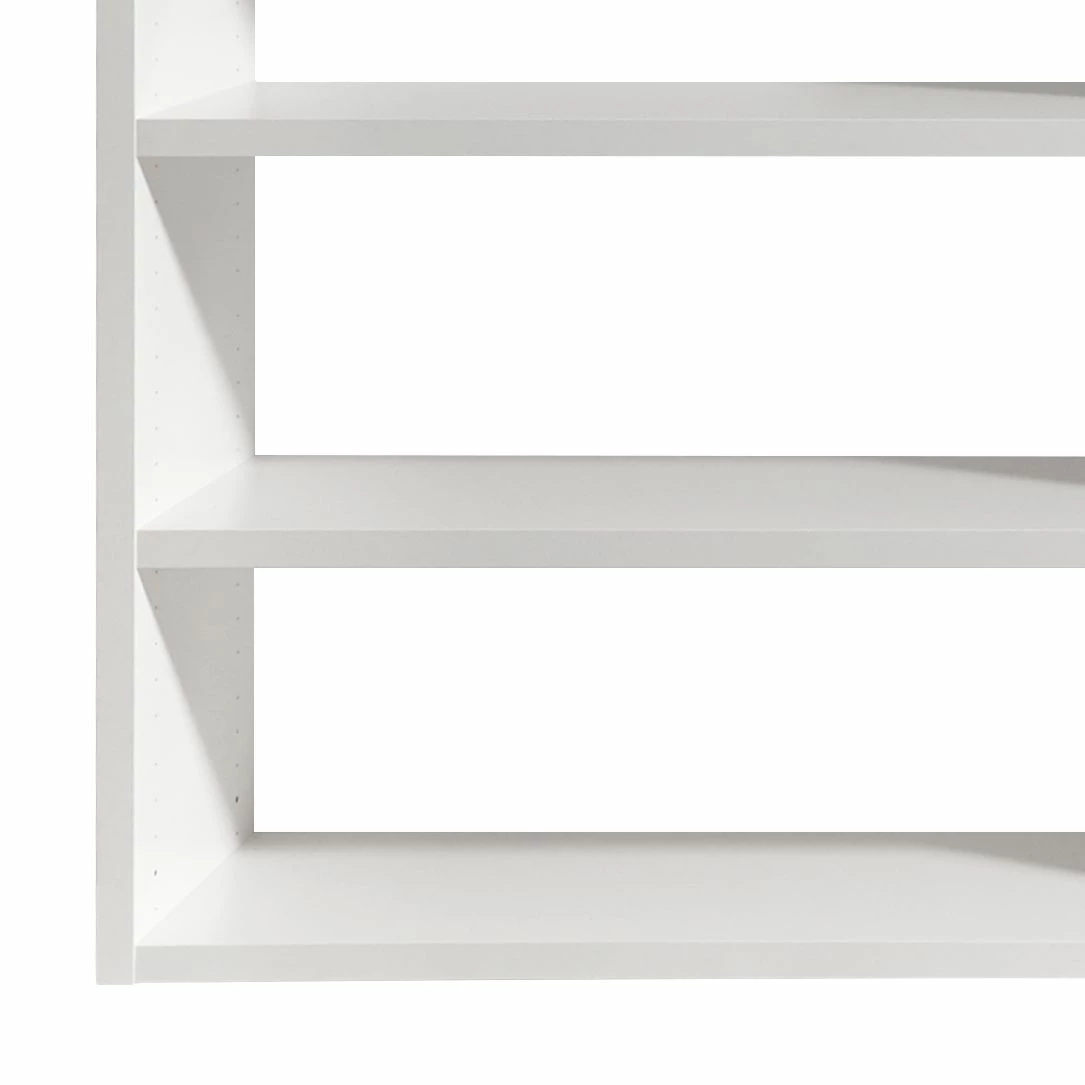 Das Möbel zeichnet sich durch ausgewählte Materialien und exzellente Verarbeitungsqualität aus. Seine Fachböden verfügen über hohe Tragfähigkeit und erlauben daher auch die Platzierung schwererer Gegenstände. Die weißen Oberflächen sind strapazierfähig und pflegeleicht.
