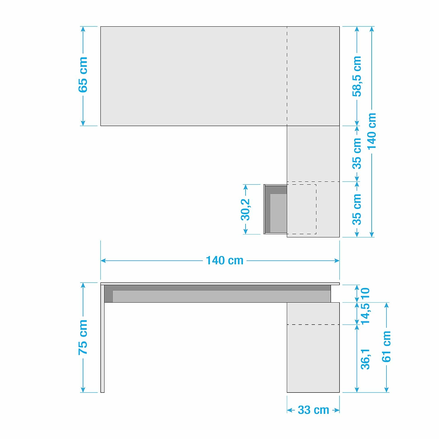 - Arbeitsplatte: 140 x 75 x 65 cm