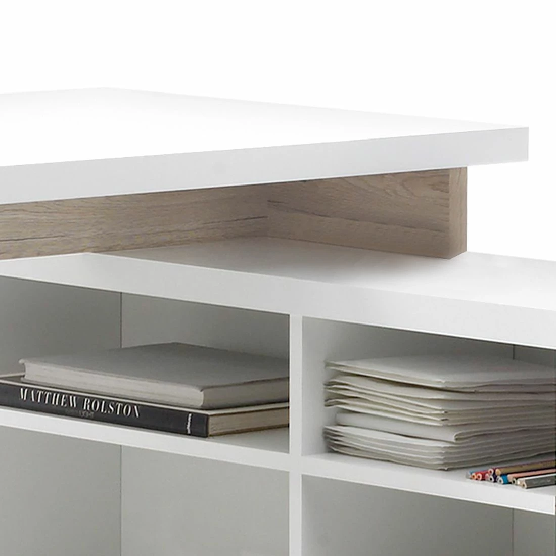 - 4 offene Fächer, 1 Schublade & 1 Container