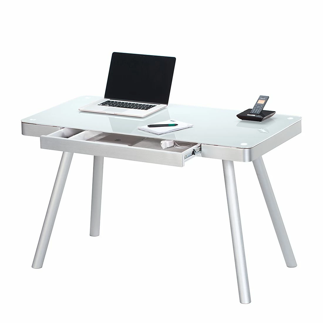 - Tischplatte: ESG-Sicherheitsglas Füße & Blende: Aluminium, gebürstet