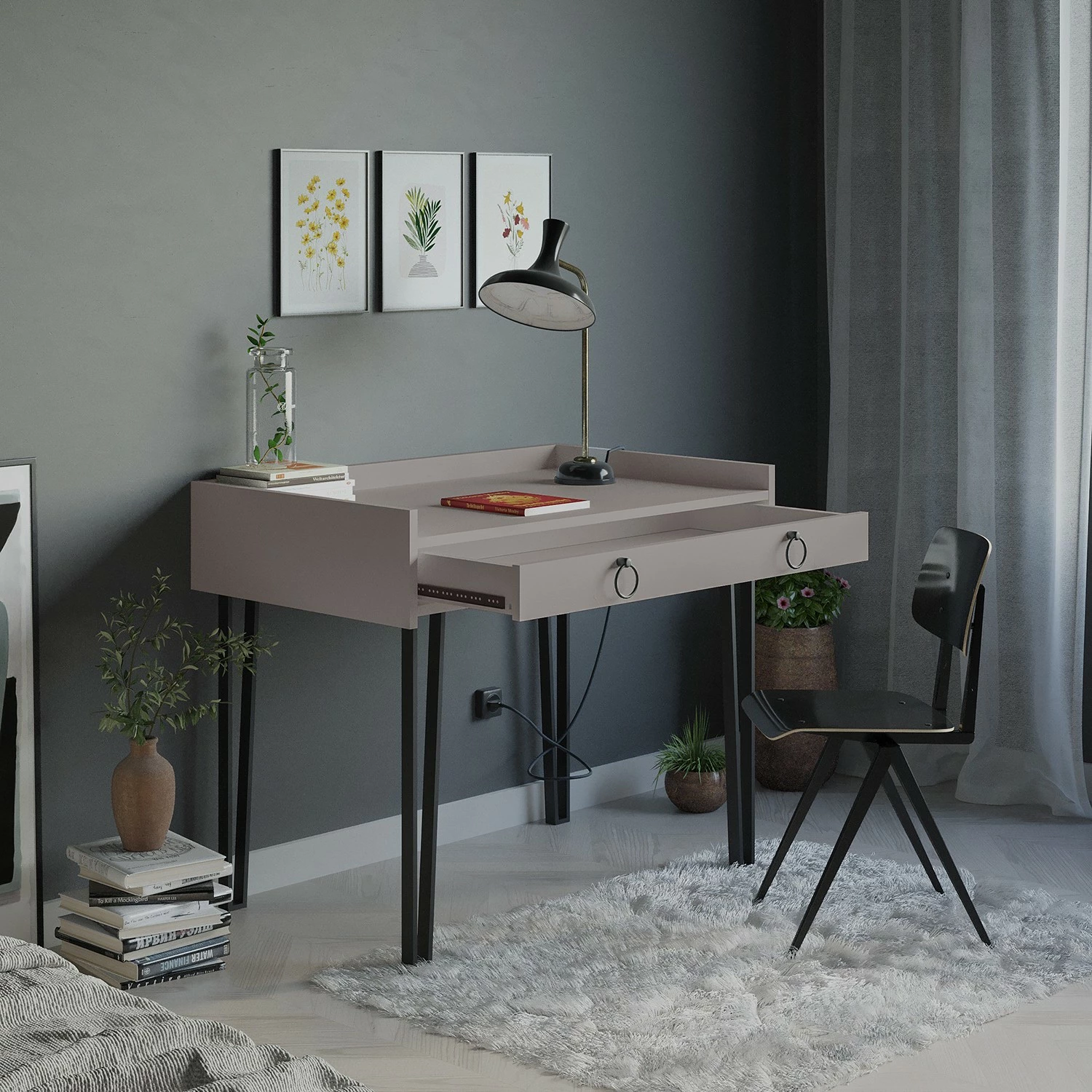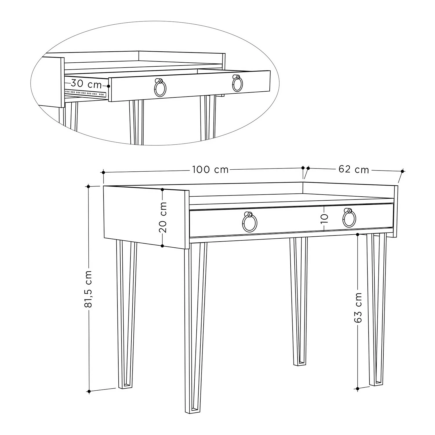 - Tischplatte & Korpus: MDF (Mitteldichte Holzfaserplatte), melaminbeschichtet