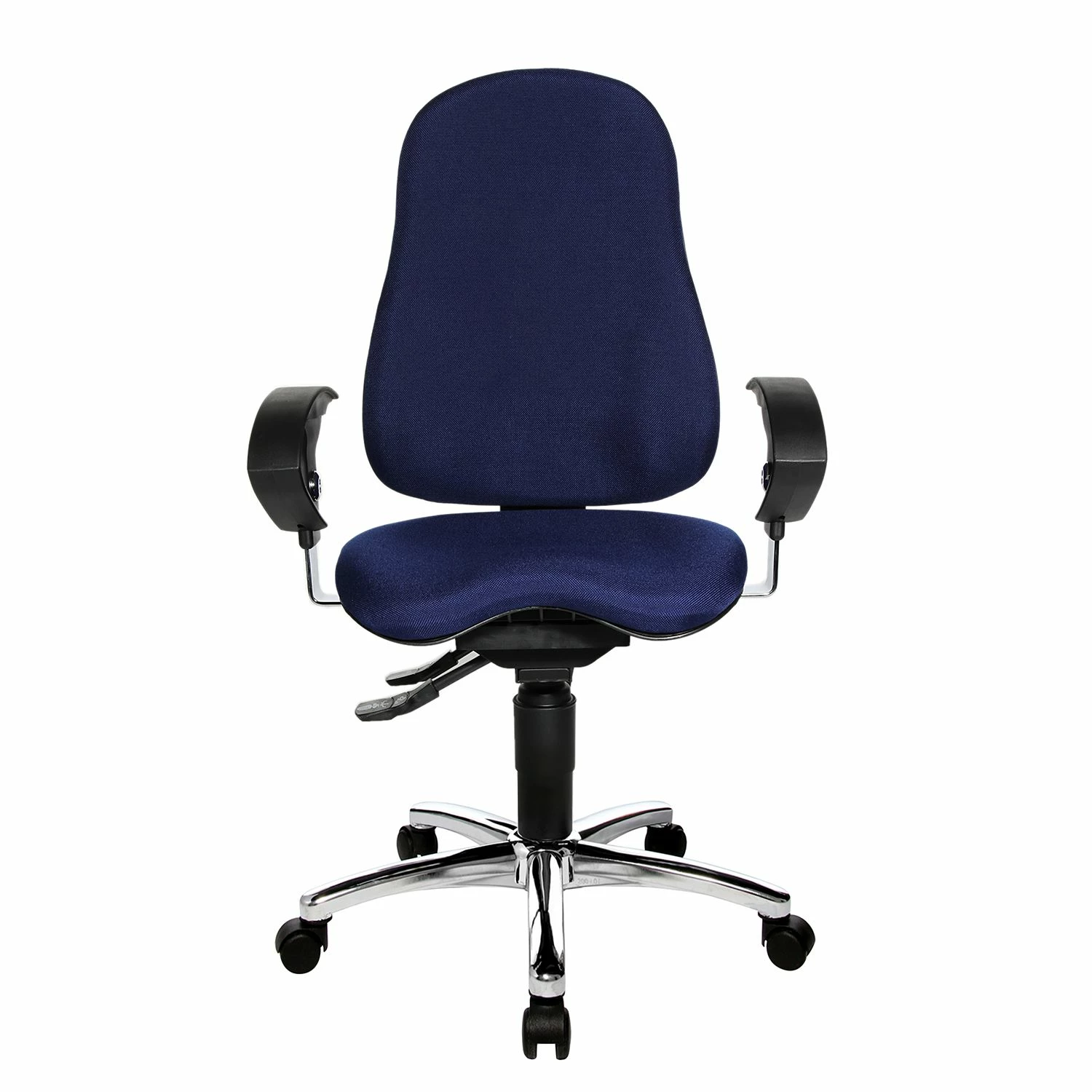 - Stabiles Fußkreuz aus verchromtem Metall mit lastgebremsten Sicherheitsdoppelrollen für Teppichböden